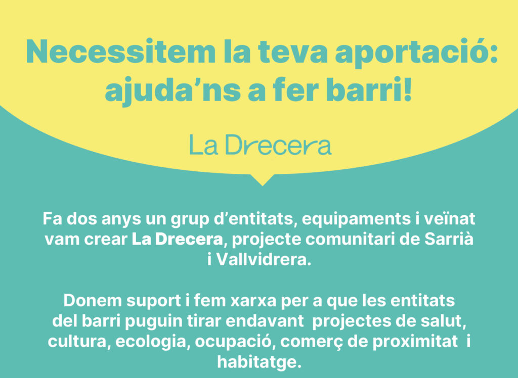 Necessitem la teva aportació. Ajuda’ns a fer barri! Fa dos anys un grup d’entitats, equipaments i veïnat vam crear La Drecera, projecte comunitari de Sarrià i Vallvidrera. Donem suport i fem xarxa per a que les entitats del barri puguin tirar endavant projectes de salut, cultura, ecologia, ocupació, comerç de proximitat i habitatge. Ara estem […]