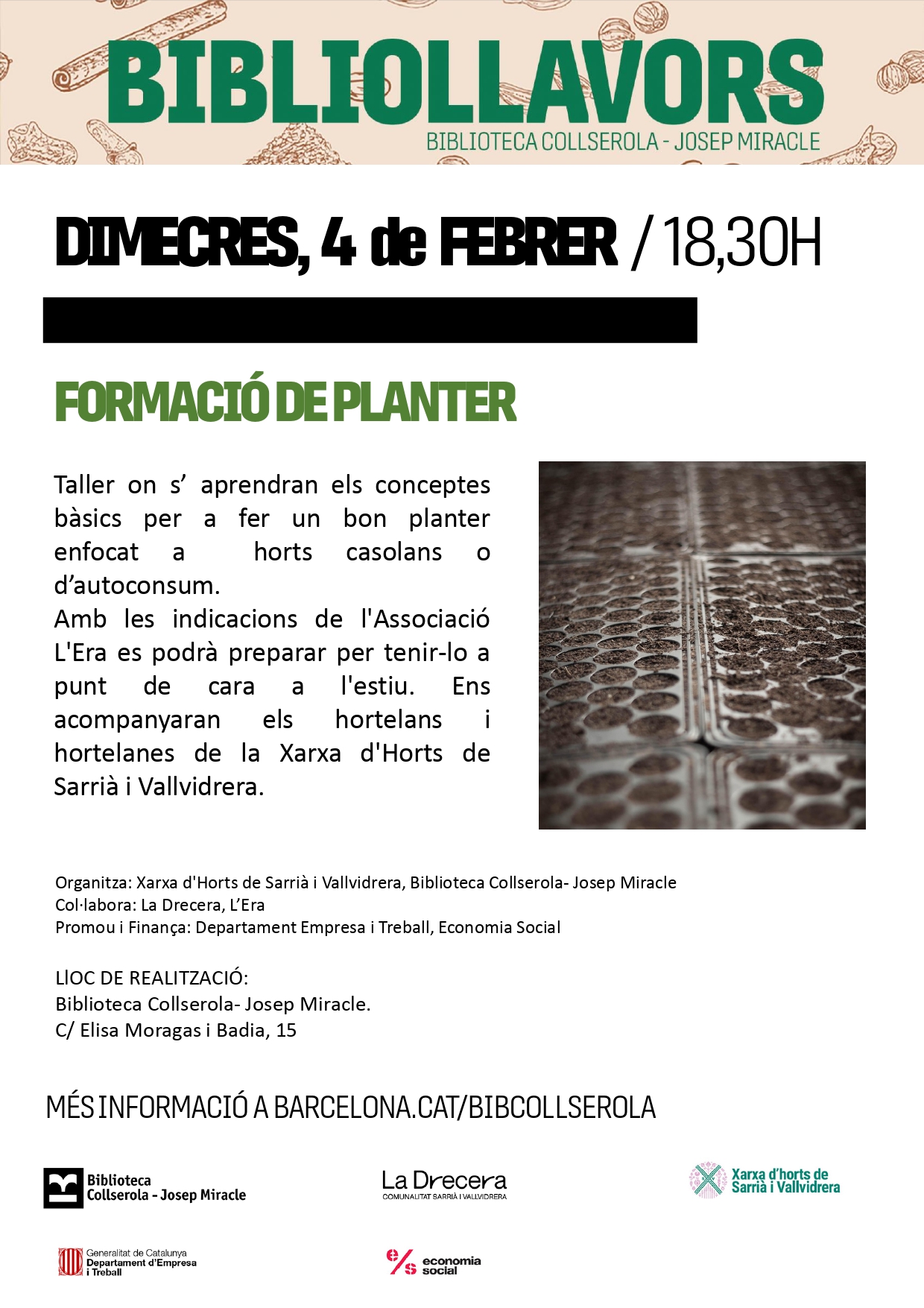 L’Associació L’Era ens ofereix una formació de com tenir èxit fent planter d’autoconsum, dins del programa de Bibliollavors, organitzat per la Biblioteca Collserola – Josep Miracle, i amb la col·laboració de la Xarxa d’Horts de Sarrià i Vallvidrera i La Drecera.
