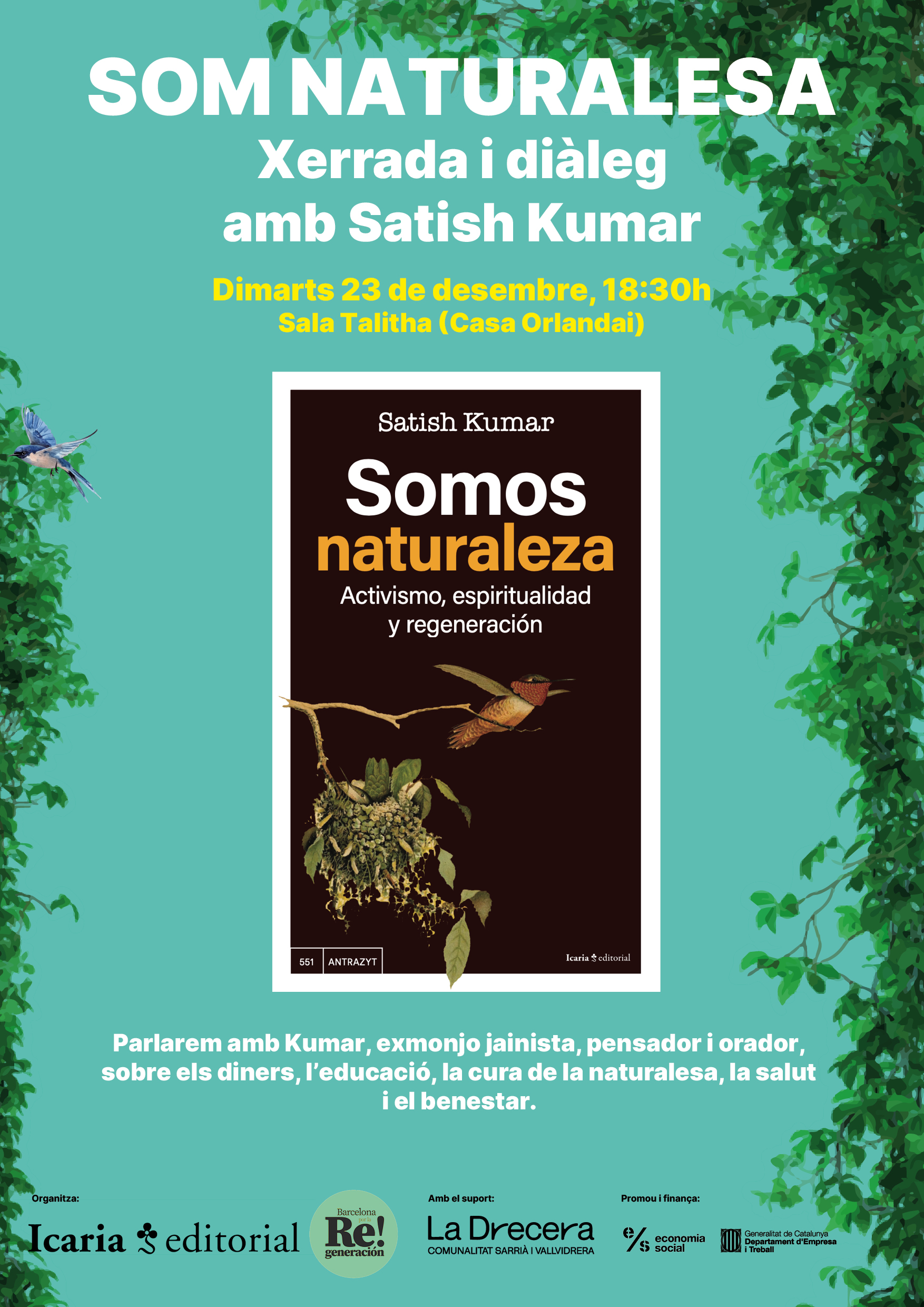 Satish Kumar ens presentarà el seu llibre, i parlarem amb ell de diners, educació, cura de la naturalesa, salut i benestar.